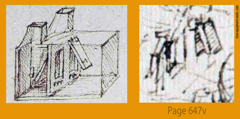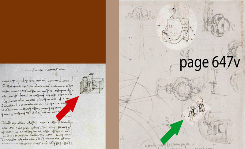 Page 647v has some more interesting objects drawn by Leonardo Da Vinci. I am not very sure what they represent and would welcome your thoughts on them. I think image A is another diving mask with the one-way valves (B) located in the bulge at the top (image A, black arrow). Images C, D and E are also probably more one-way valve systems connected to the tubing. Please let me know, via the contact page, if you have any other ideas about these.