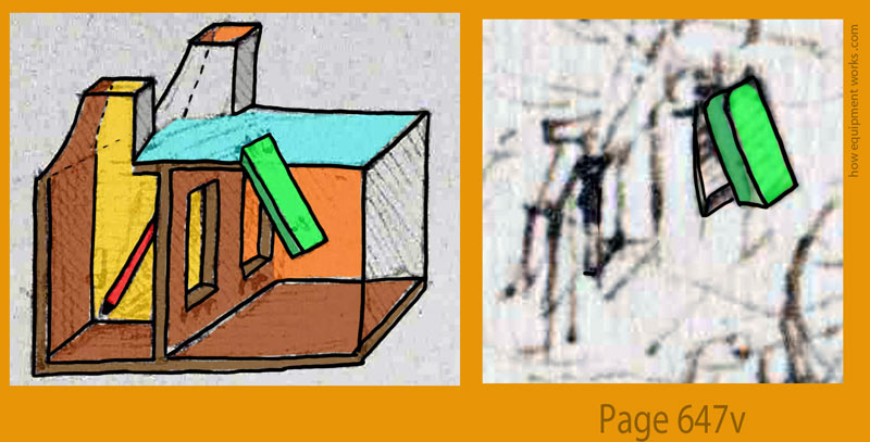 Leonardo was quite secretive about his underwater devices because he feared that they might be used for dangerous activities. For example, divers at that time (and even in the present) could be used by the military to destroy ships. Perhaps for this reason, he has written extremely little on how the breathing system works. One has to, like we have done so far, use the images to guess how things work. However, with some more detective work, we can find some text where Leonardo mentions how the one-way valves work. We again go to page 647v, which shows the diving mask. On this page, there is a small diagram (green arrow) that is interesting. I will show it in more detail later. I will show you how this little diagram will lead us to Leonardo’s textual description of his breathing system.
