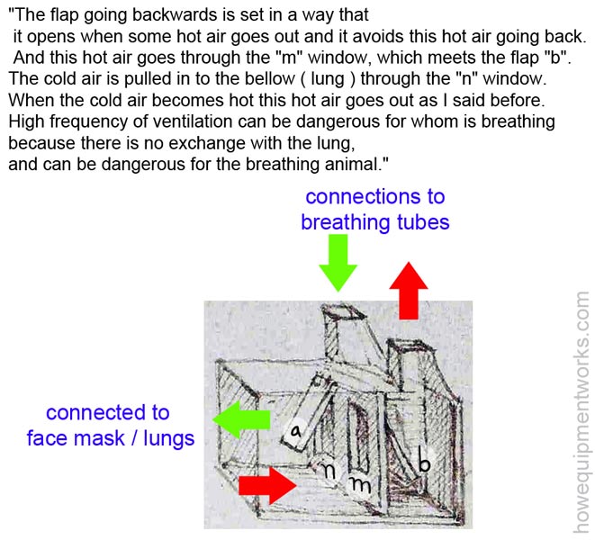 The small diagram seems to show a detailed cross-section of where the tubes are attached in the larger diagram next to it. And in this cross-section, if you look closely, you can see one-way valves! (Do not worry if you are not convinced, as I will show you better diagrams later). These one-way valves will ensure that inspiration always occurs from one tube (green) and that expiration will always occur from the other tube (red). This is probably the oldest document that shows valves being used in a breathing system. Isn’t it amazing that this was done 500 years ago? As mentioned before, do not worry if you are not yet convinced that the diagram shows valves. I will show you better material shortly.
