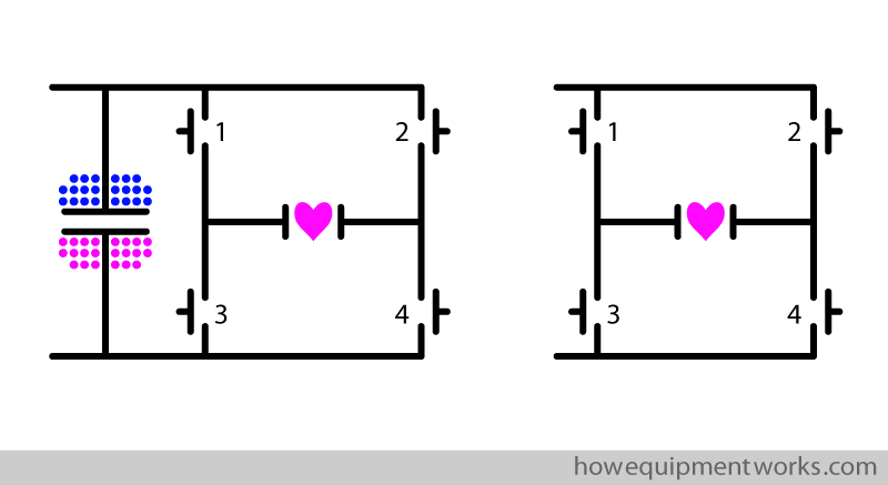 The capacitor is charged and is now ready for discharge into the patient. In the diagram below, the “discharge part” of the defibrillator circuit is shown in the green box. You will notice that there are four switches (1,2,3,4) in this area. These switches will, later, connect the heart to the capacitor. However, at present, these four switches are “OFF” and therefore the charged capacitor is not connected to the heart. The capacitor, at this point, is simply storing the charge.