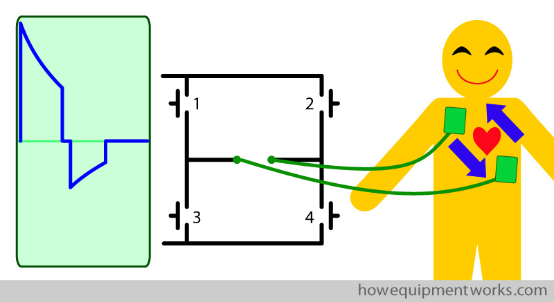 The biphasic defibrillator starts by sending current through the heart in the “forward” direction. This is done in a similar way to how the monophasic defibrillator delivers current to the heart. i.e. switches 1 and 4 are put “ON”. However, there is a crucial difference. In the case of the biphasic defibrillator, these two switches are switched “OFF” before the capacitor has finished discharging. When these switches are switched “OFF”, the current flow to the heart stops and the oscilloscope tracing returns to the baseline (zero). However, the capacitor still has some charge left in it, as was prevented from emptying completely.