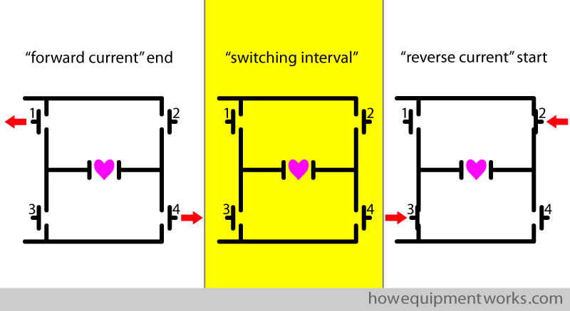 The switching interval starts when the “forward current” switches (1 and 4) are switched “OFF” and ends when the “reverse current” switches (2 and 3) are switched “ON”. During the switching interval”, all four switches are in the “OFF” position. The “switching interval” is something that has been deliberately added by the designers of defibrillators. The switching interval provides adequate time for the “forward” current switches (1 & 4) to first “properly” switch “OFF” before the “reverse” current switches (2 & 3) are put “ON”.