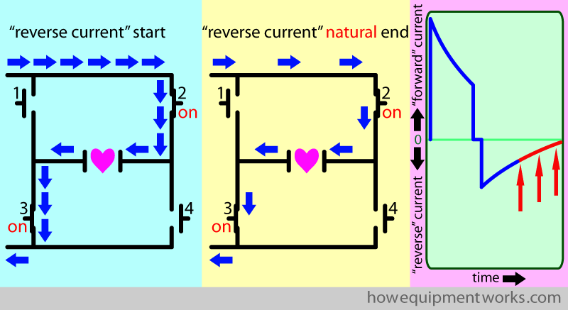In the diagram below, I have named the end of the reverse current as the “reverse current natural end”. What I mean is, this is how the waveform would look like if we let the capacitor completely discharge into the heart, without us doing anything more to the switches. In this situation, as demonstrated below, the waveform shows that the reverse current gradually decreases and eventually becomes zero. As I will explain later, in real life, we manipulate the switches and prevent the reverse current from ending in a “natural” way.